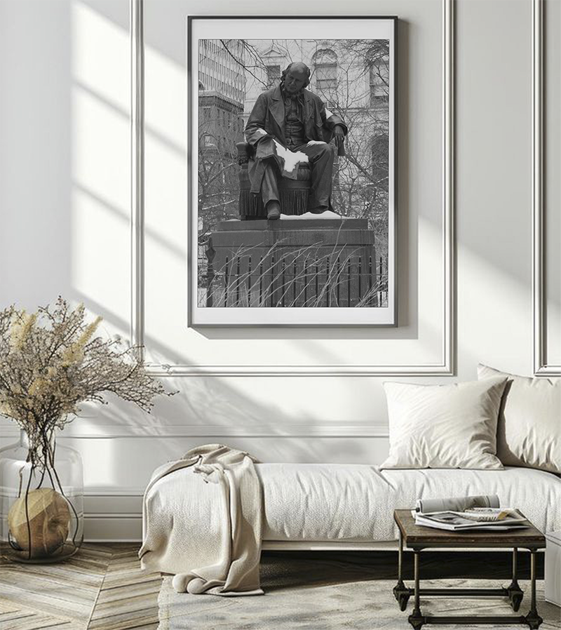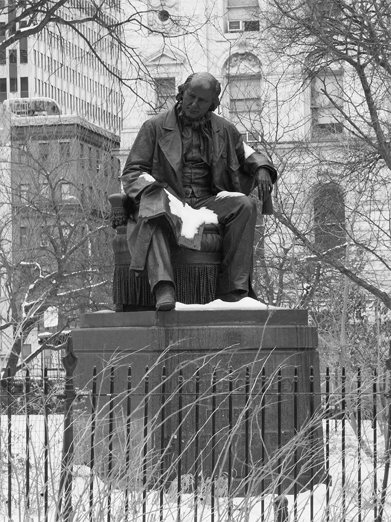Sentado en silencio perpetuo, el bronce se inclina hacia la eternidad, cargando no solo la nieve del invierno, sino las ideas que alguna vez moldearon una época. A su alrededor, la ciudad avanza indiferente, pero él permanece: firme, introspectivo y eterno.